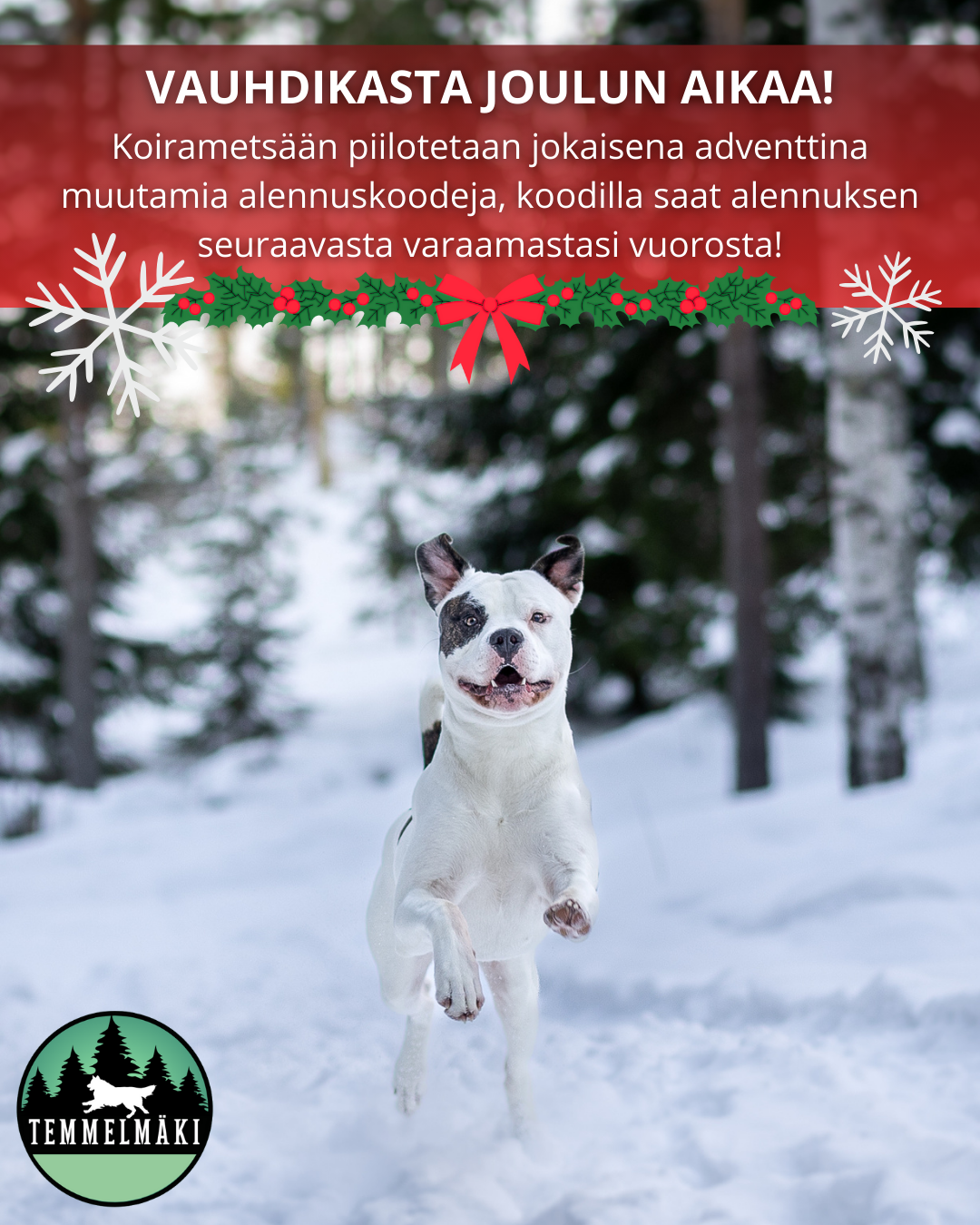 Koirametsä Temmelmäen Joulu tulee taas tänä vuonna! Temmelmäellä on joulun tunnelmaa kun koirametsää koristellaan valoin ja havuin 17-23.12. Koirametsän kodalta löydät Temmelmäen joulukuusen! Pakkaa tähtitortut ja glögit kassiin ja tule nauttimaan koirametsän joulusta ja metsän rauhasta yhdessä parhaan ystäväsi kanssa!
